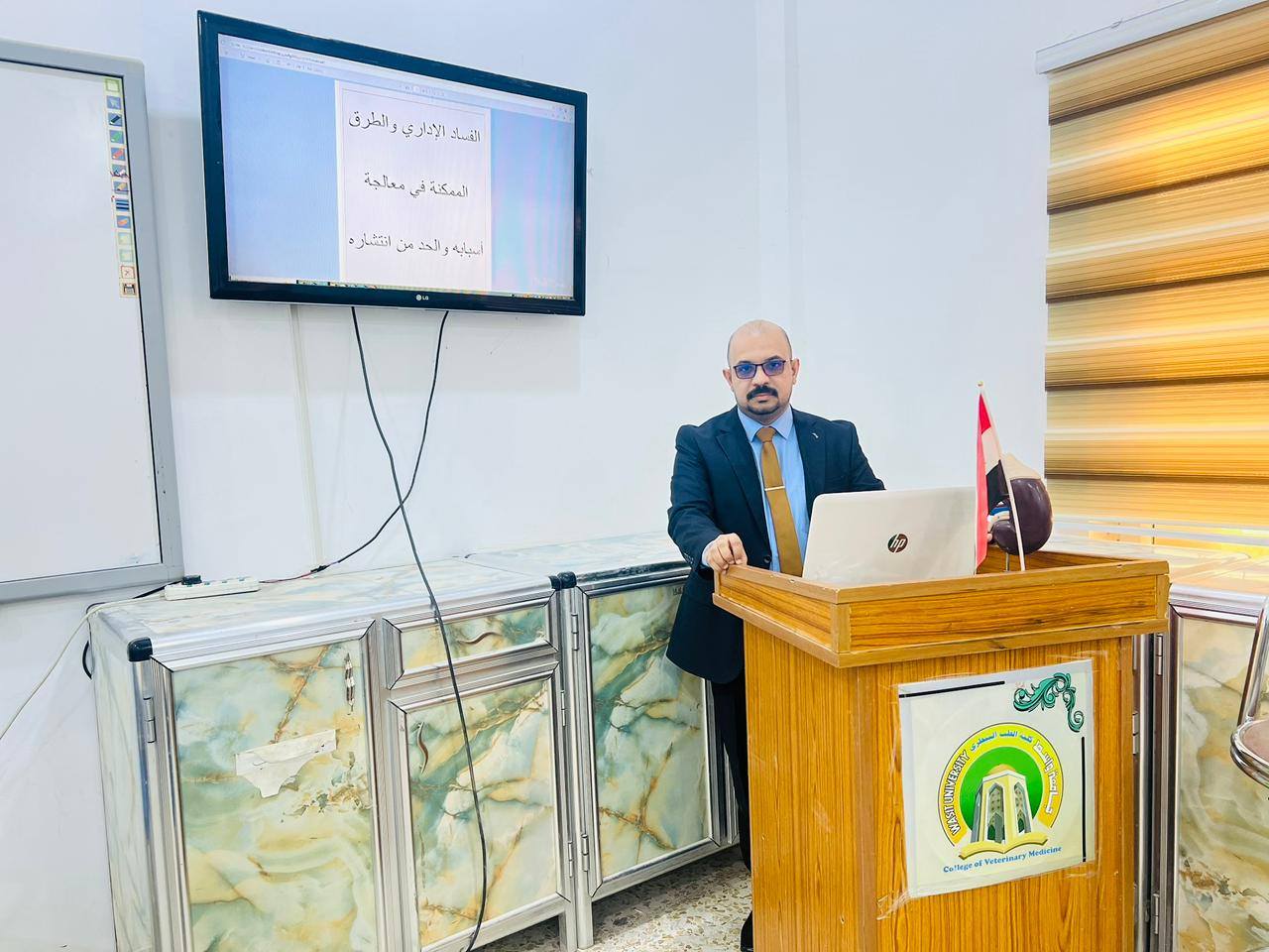 اقامت كلية الطب البيطري جامعة واسط ندوة بعنوان مكافحة الفساد الاداري والطرق الممكنة في معالجة اسبابه والحد من انتشاره قدمها السيد ( بارق مالك كاظم ) بحضور عدد من تدريسي وموظفي وطلبة الكلية .