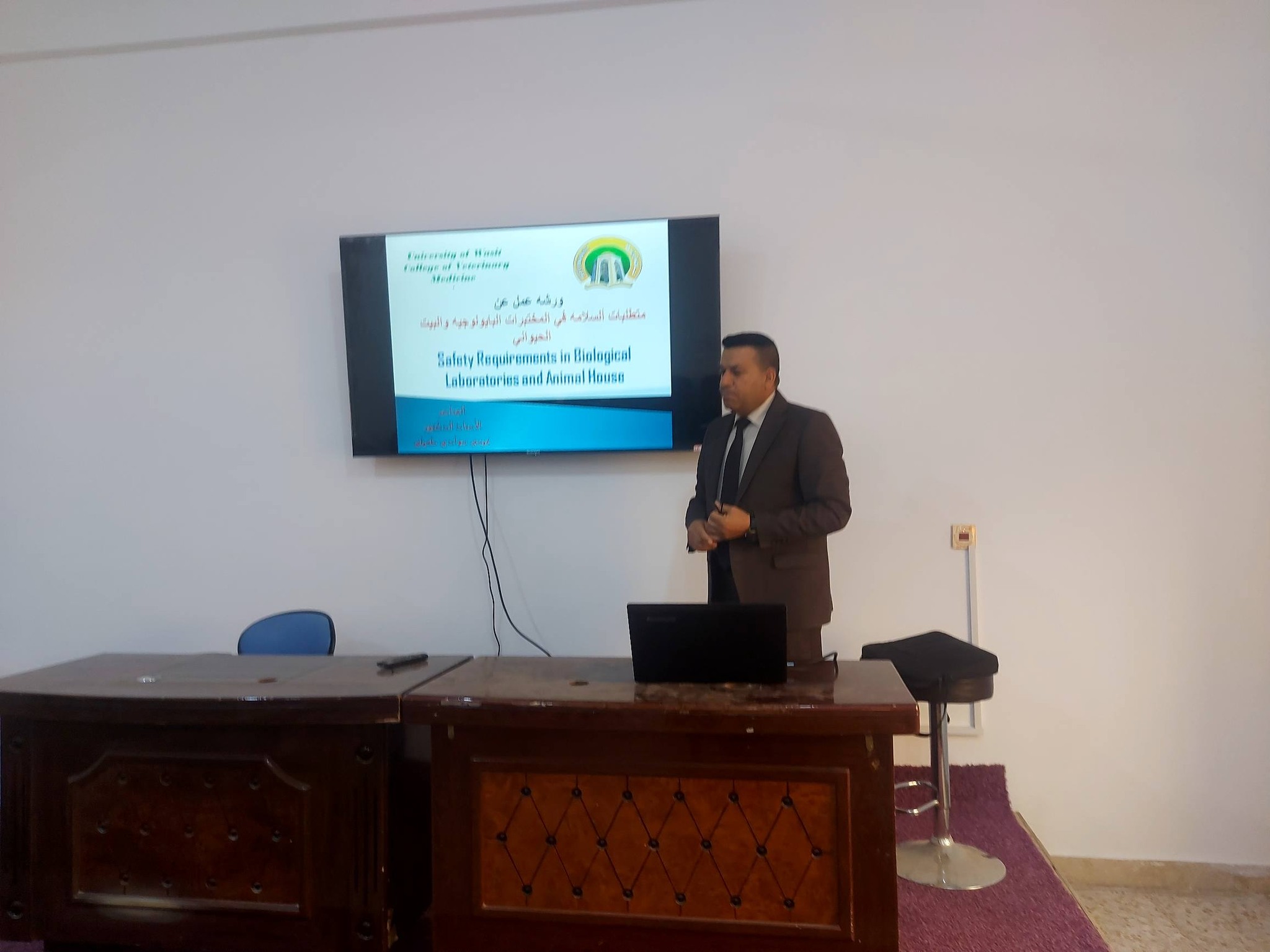 أقامت كليه الطب البيطري ومن ضمن نشاطات فرع الأحياء المجهرية ورشة عمل عن (متطلبات ألسلامه في المختبرات البايولوجيه والبيت الحيواني) والتي حاضره فيها الأستاذ الدكتور ( عيسى سوادي )