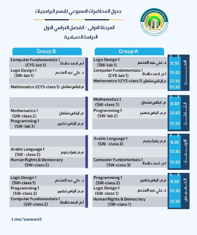 جدول المحاضرات الاسبوعي قسم علوم الحاسوب المستوى الاول بولونيا 2025-2026
