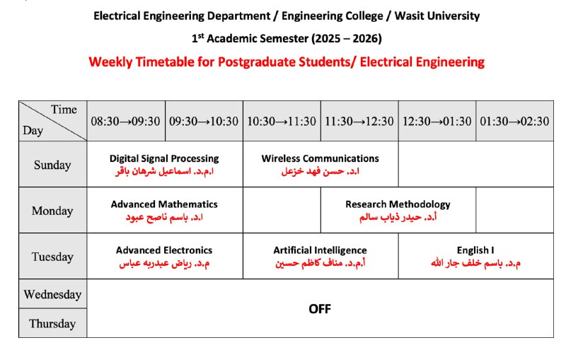 الجدول الاسبوعي / الكورس الاول / الدراسات العليا/ كهرباء عام