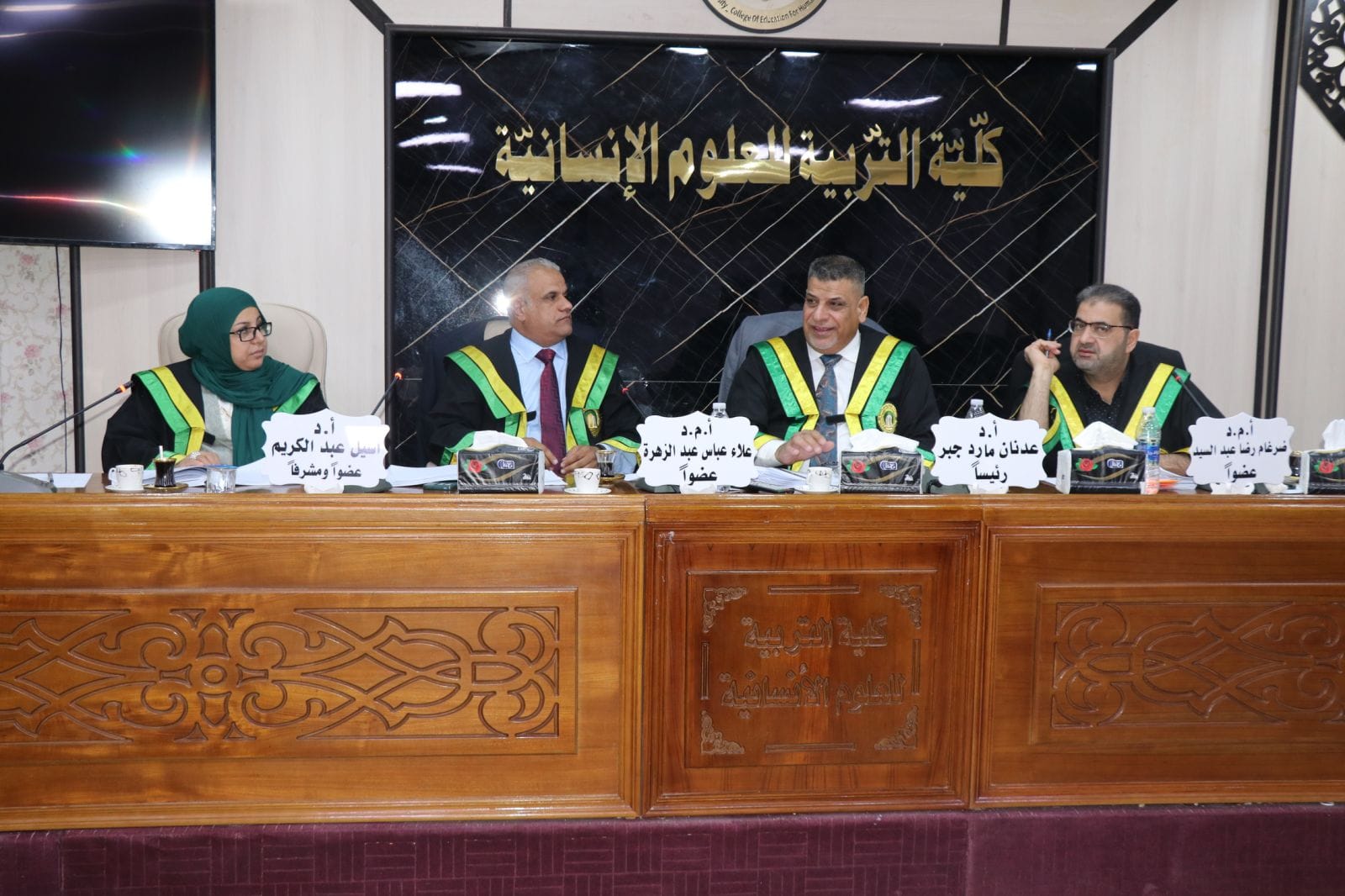 ناقشت كلية التربية للعلوم الانسانية بجامعة واسط رسالة ماجستير بعنوان ( الاستدلال الاخلاقي وعلاقته بالتحيزالضمني لدى تدريسيي الجامعة ) .