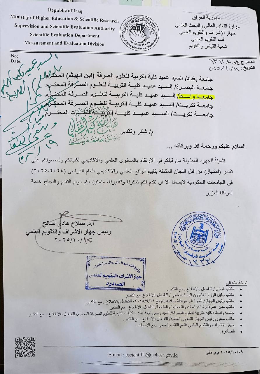تُوّجت كليتنا العزيزة بتقدير "امتياز" في التقييم العلمي والأكاديمي للعام الدراسي 2024-2025، وذلك من قبل وزارة التعليم العالي والبحث العلمي، تقديرًا لجهودها في ترسيخ الجودة الأكاديمية والتميّز البحثي. هذا الإنجاز ثمرة التفاني والعمل الجاد من كادرنا التدريسي والإداري، وحرص طلبتنا على التفوق والنجاح. ألف مبارك لكليتنا هذا التميّز المستحق، وإلى مزيد من النجاحات بإذن الله!
