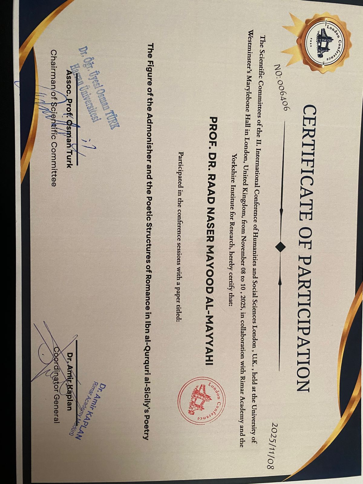 شارك الأستاذ الدكتور رعد ناصر مايود الوائلي، التدريسي في كلية التربية للعلوم الإنسانية، في مؤتمر العلوم الإنسانية الذي عُقد في جامعة (ويستمنستر) في لندن بمشاركة دولية واسعة , للفترة من الثامن إلى الحادي عشر من نوفمبر 2025.