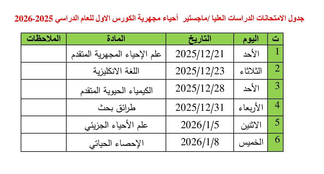 جدول الامتحانات الدراسات العليا/ ماجستير أحياء مجهرية الكورس الاول للعام الدراسي 2025-2026