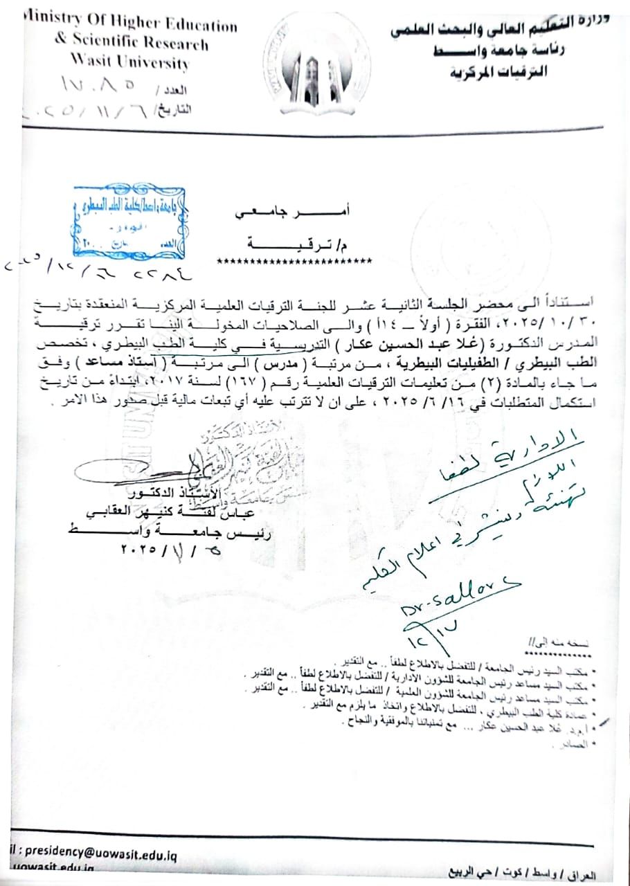 بكل فخر واعتزاز تتقدّم عمادة كلية الطب البيطري / جامعة واسط المتمثلة بعميدها الاستاذ الدكتور ( ستار راشد العقابي ) ومنتسبيها بأصدق التهاني وأجمل التبريكات إلى الأستاذ المساعد الدكتور (علا عبد الحسين عكار) بمناسبة ترقيتها العلمية، تقديرًا لجهودها العلمية المتميزة وإسهاماتها الأكاديمية الرصينة في خدمة العلم والجامعة. سائلين المولى عزّ وجلّ لها دوام التوفيق والسداد، ومزيدًا من العطاء والتألّق في مسيرتها العلمية،