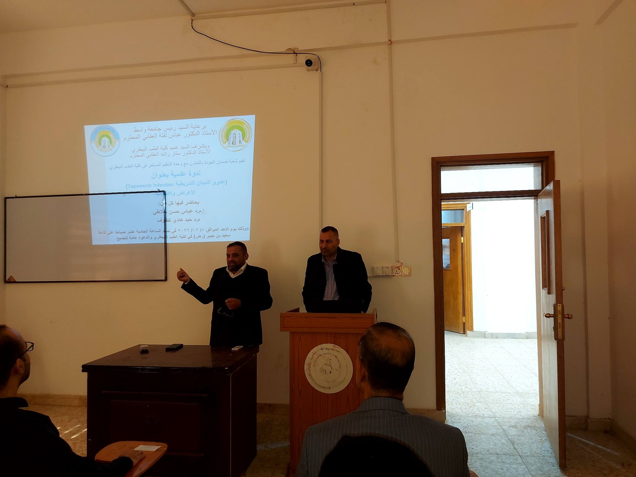 ضمن النشاطات العلمية وبالتزامن مع اسبوع الريادة ، أقامت كلية الطب البيطري / جامعة واسط ندوة علمية بعنوان (عدوى الديدان الشريطية : الاعراض والاسباب )، بحضور عدد من التدريسي وموظفي و لطلبة الكلية . حاضر فيها كلٌّ من: الأستاذ المساعد الدكتور ( عباس حسن خلاطي ) م. العميد للشؤون الادارية والمدرس الدكتور ( حيدر هادي كطوف ).