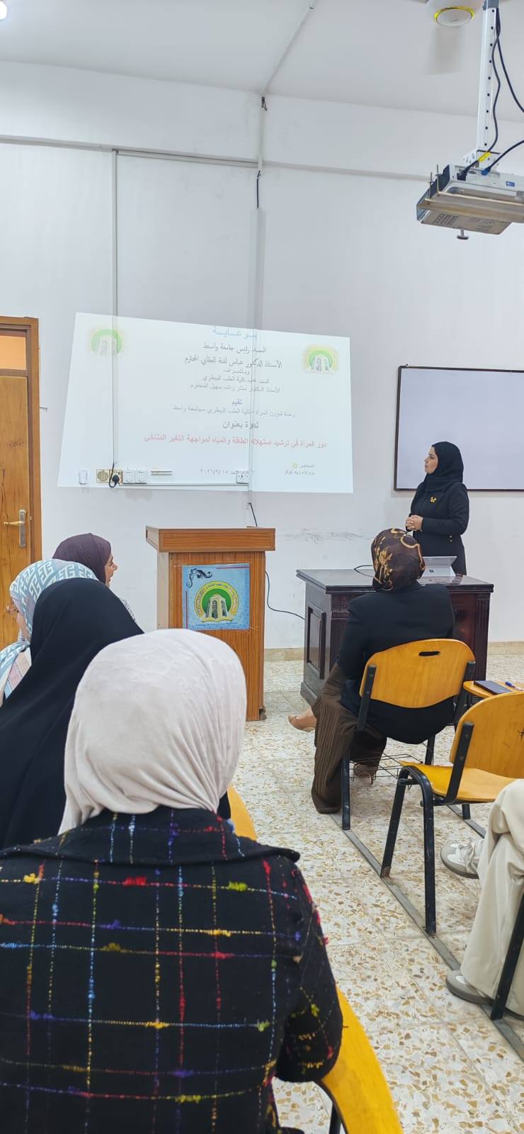 قامت وحدة شؤون المرأة في كلية الطب البيطري/جامعة واسط ندوة بعنوان ( دور المرأة في ترشيد استهلاك الطاقة والمياه لمواجهة التغير المناخي) القتها ( م.م. الاء زياد كوكز ) وذلك يوم الاثنين الموافق ٢٠٢٦/٢/١٦