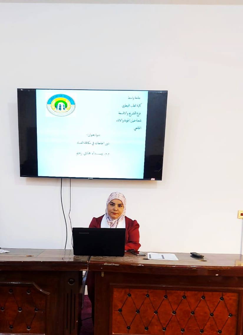 برعاية عميد الكلية الاستاذ الدكتور ( ستار راشد العقابي ) ، نظّمت كلية الطب البيطري ندوة علمية بعنوان "دور الجامعات في مكافحة الفساد"، وذلك ضمن نشاطاتها التوعوية الهادفة إلى تعزيز القيم الأخلاقية وترسيخ مبادئ النزاهة والشفافية في المجتمع الأكاديمي حاضرت فيها ( م.م. بيداء هادي رحيم ) .