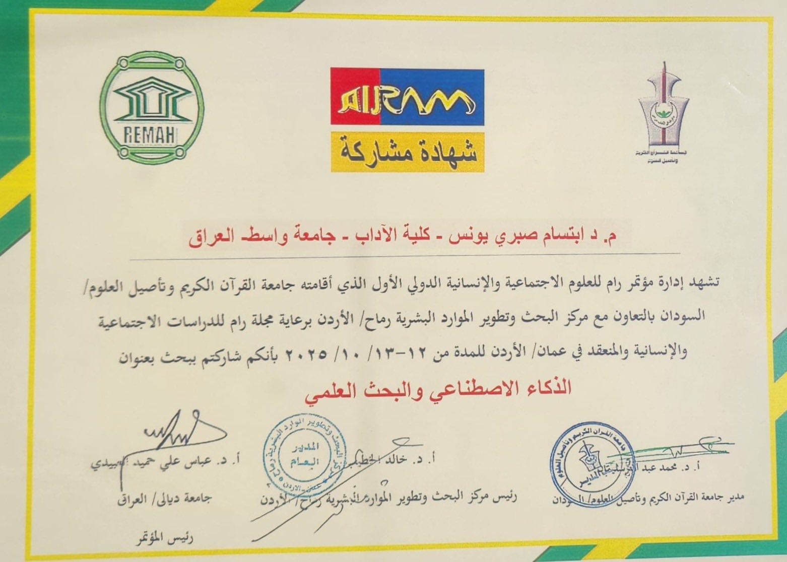 Asst. Prof. Dr. Ahmed Khudair Hussein and Asst. Prof. Dr. Ibtisam Sabri Younis, faculty members of the Department of Sociology, College of Arts, Wasit University, participated in the 1st International Conference on Social and Human Sciences (RAM) held in Jordan, in a hybrid format (in-person and online). The event was organized in collaboration with Al-Quran Al-Kareem University, Sudanese Center for Scientific Foundations, and RAMAH Center in Jordan, under the auspices of RAM Journal for Social and Human Studies, with participation from a distinguished group of Arab researchers.