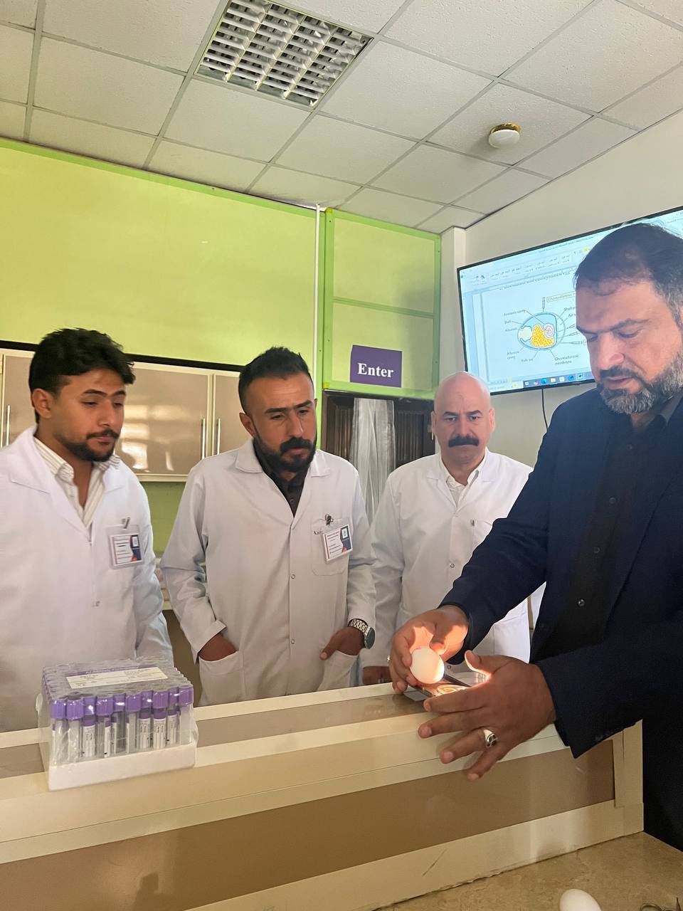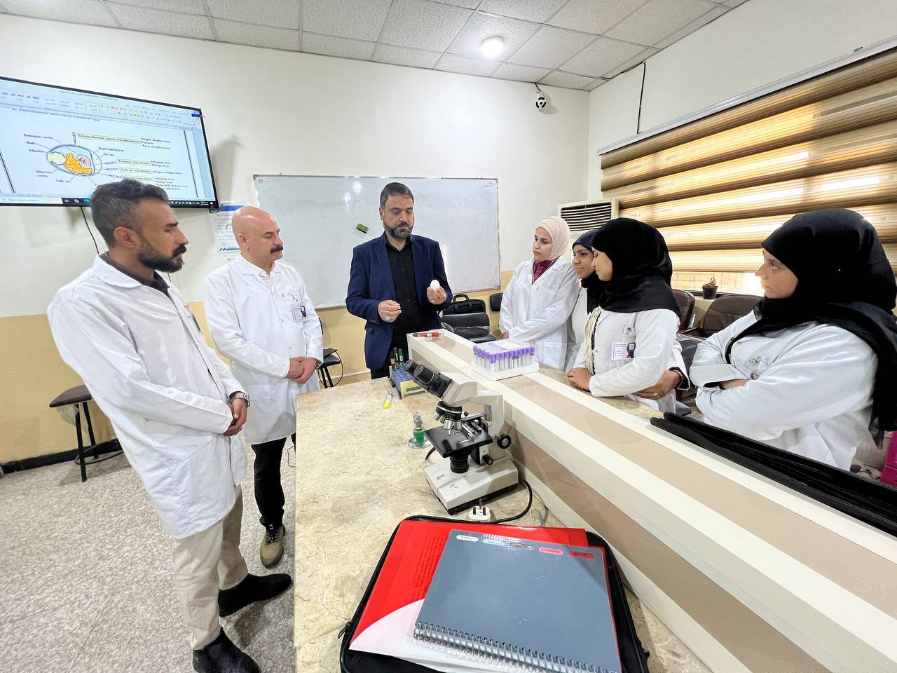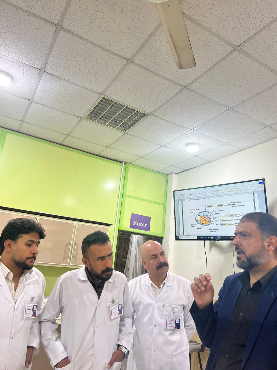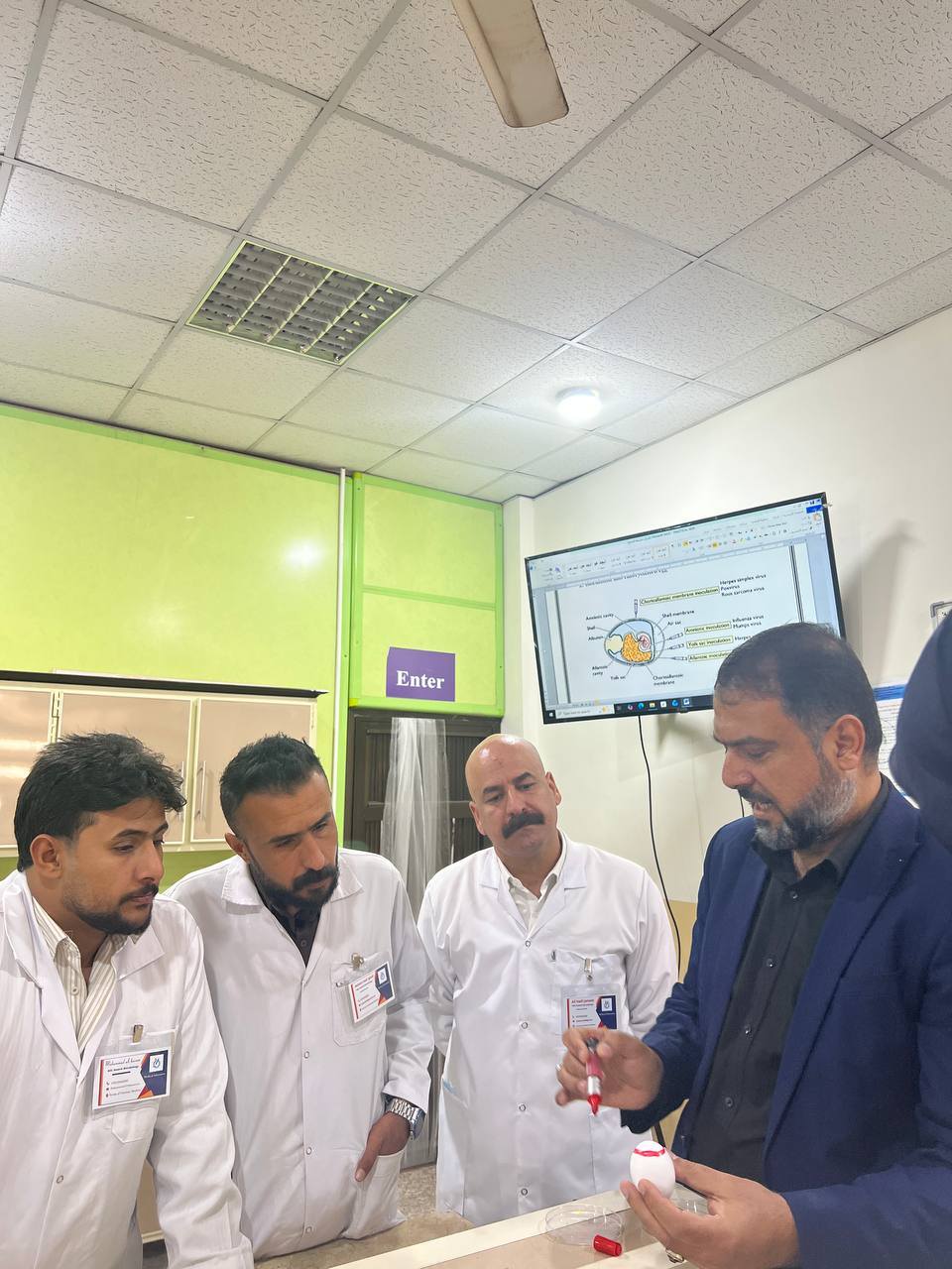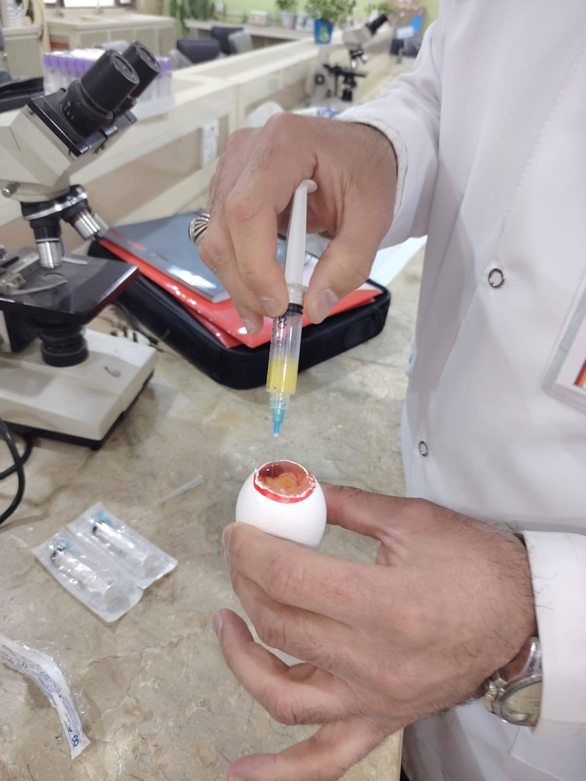 ضمن إطار المناهج الدراسية لطلبة الدراسات العليا في كلية الطب البيطري / جامعة واسط، أُجريت تجربة عملية متقدمة تمثّلت في حقن فايروس داخل أجنة الدجاج بعمر 13 يوماً، وذلك بإشراف أستاذ المادة الأستاذ الدكتور ( حسين علي محمد البياتي ) .