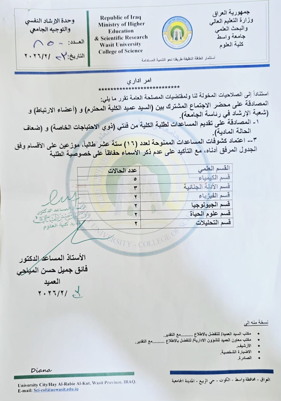 استناداً إلى الصلاحيات المخولة لنا ولمقتضيات المصلحة العامة تقرر ما يلي: المصادقة على محضر الاجتماع المشترك بين السيد عميد الكلية المحترم) و (أعضاء الارتباط و شعبة الإرشاد في رئاسة الجامعة). - المصادقة على تقديم المساعدات لطلبة الكلية من فئتي ذوي الاحتياجات الخاصة) و (ضعاف الحالة المادية). -- اعتماد كشوفات المساعدات الممنوحة لعدد (١٦) ستة عشر طالباً، موزعين على الأقسام