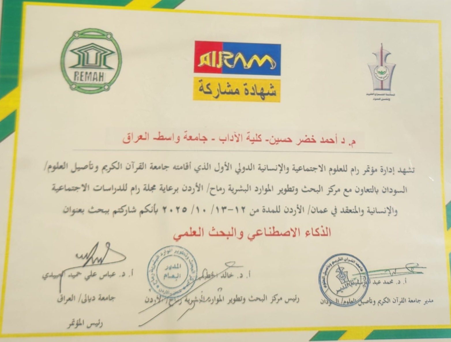 شارك التدريسيان في قسم علم الاجتماع بكلية الآداب بجامعة واسط، م.د. #أحمد خضير حسين وم.د. #ابتسام صبري يونس، في المؤتمر الدولي الأول للعلوم الاجتماعية والإنسانية (رام)، الذي استضافته المملكة الأردنية الهاشمية، بصورة مدمجة (حضورية وإلكترونية)، بالتعاون بين جامعة القرآن الكريم وتأصيل العلوم في السودان ومركز رماح في الأردن، وبرعاية مجلة رام للدراسات الاجتماعية والإنسانية، بمشاركة نخبة من الباحثين العرب.