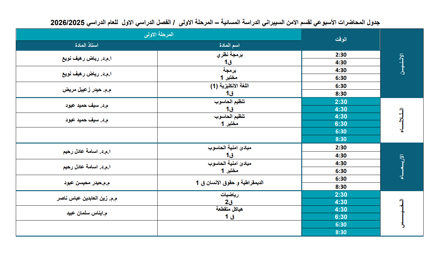 جدول المحاضرات الاسبوعي قسم الامن السيبراني الدراسة الصباحية المستوى الاول بولونيا 2025-2026