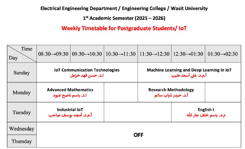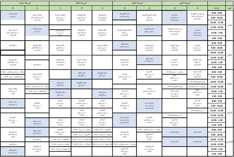 الجدول الاسبوعي / الكورس الاول / الدراسات العليا/ كهرباء عام