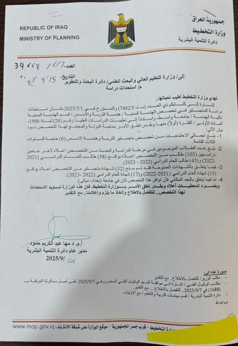 حصلت موافقة وزارة التخطيط حول استحداث دراسات عليا في كلية الهندسة / قسم الهندسة المدنية / تخصص التربة والاسس