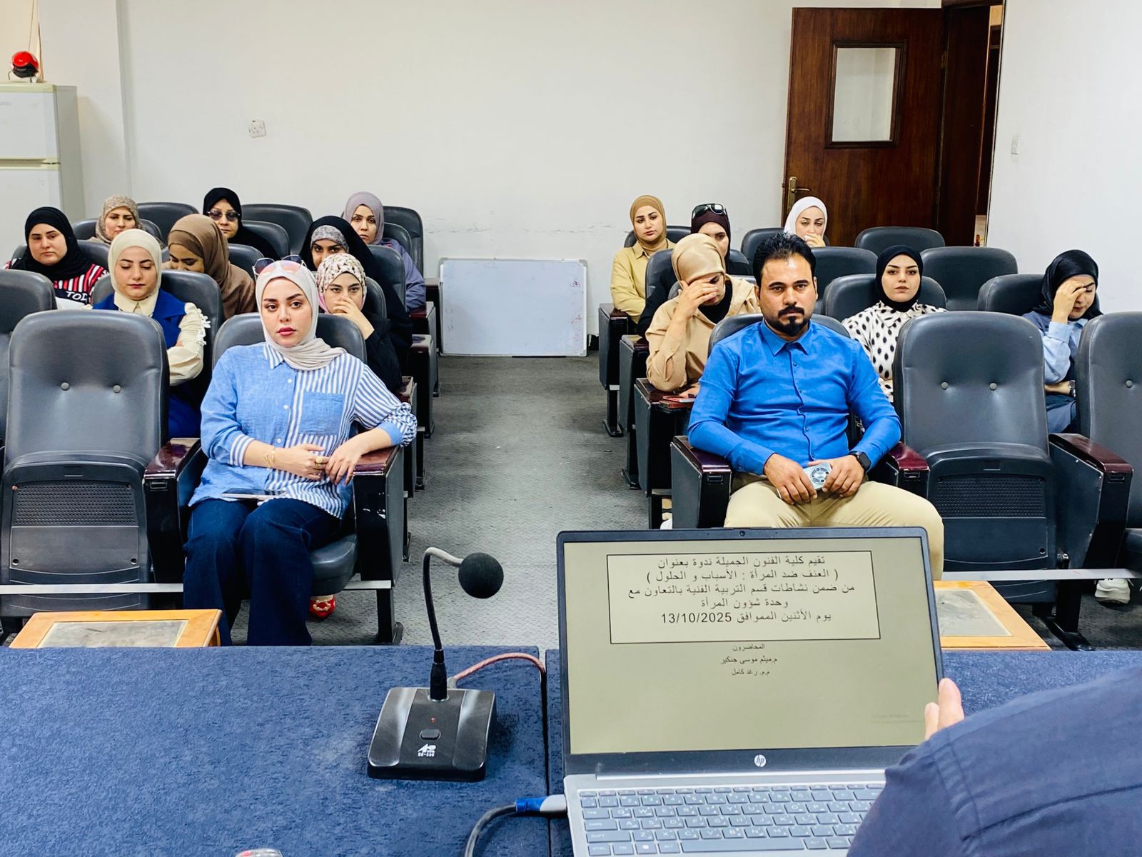 نظمت وحدة شؤون المرأة في كلية الفنون الجميلة بجامعة واسط ندوة توعوية بعنوان “العنف ضد المرأة: الأسباب والحلول”، وذلك ضمن نشاطاتها الداعمة لقضايا المرأة والمجتمع، بحضور عدد من الطلبة والموظفين .