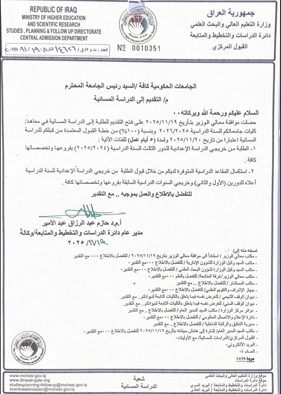 اعادة فتح التقديم على الدراسة المسائية بأقسامها العلمية (المحاسبة، ادارة الاعمال ، علوم مالية ومصرفية ، اقتصاد رقمي ) حسب الضوابط المعلنة سابقاً وبمعدل (٥٦.٥)و تشمل كافة الخريجين من الدورين الاول والثاني والدور الثالث وكذلك كافة خريجي السنوات السابقة لتوفر المقاعد الشاغرة في خطة القبول