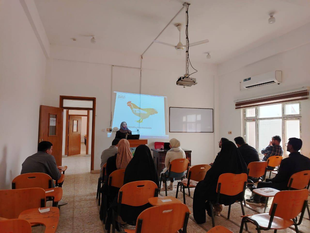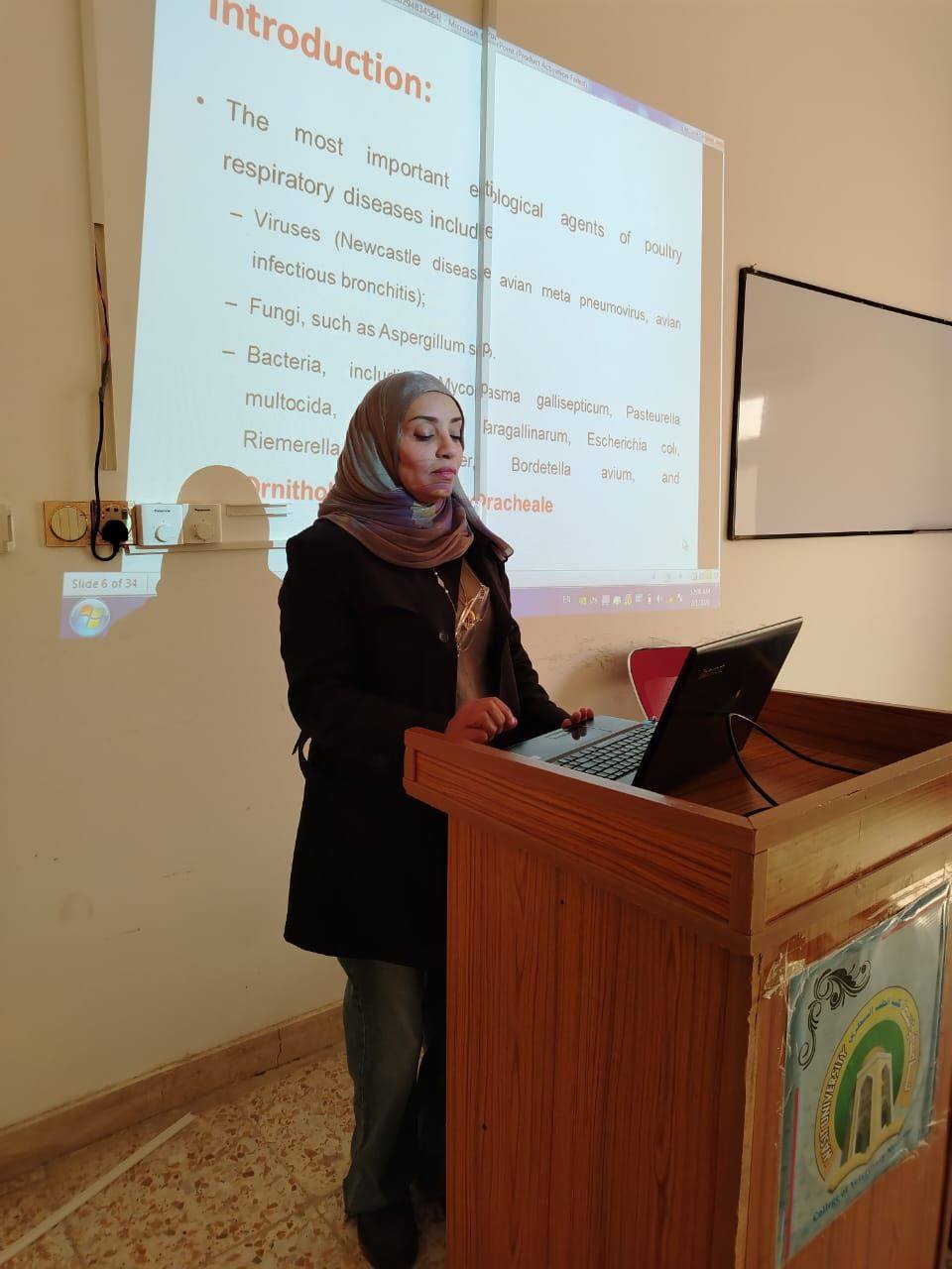 أقامت كلية الطب البيطري ندوة علمية بعنوان (الأمراض البكتيرية في الدواجن )، حاضرت فيها المدرس الدكتور ( سحر عبد الحسن ) ، وذلك ضمن النشاطات العلمية بحضور عدد من موظفي وطلبة الكلية . .