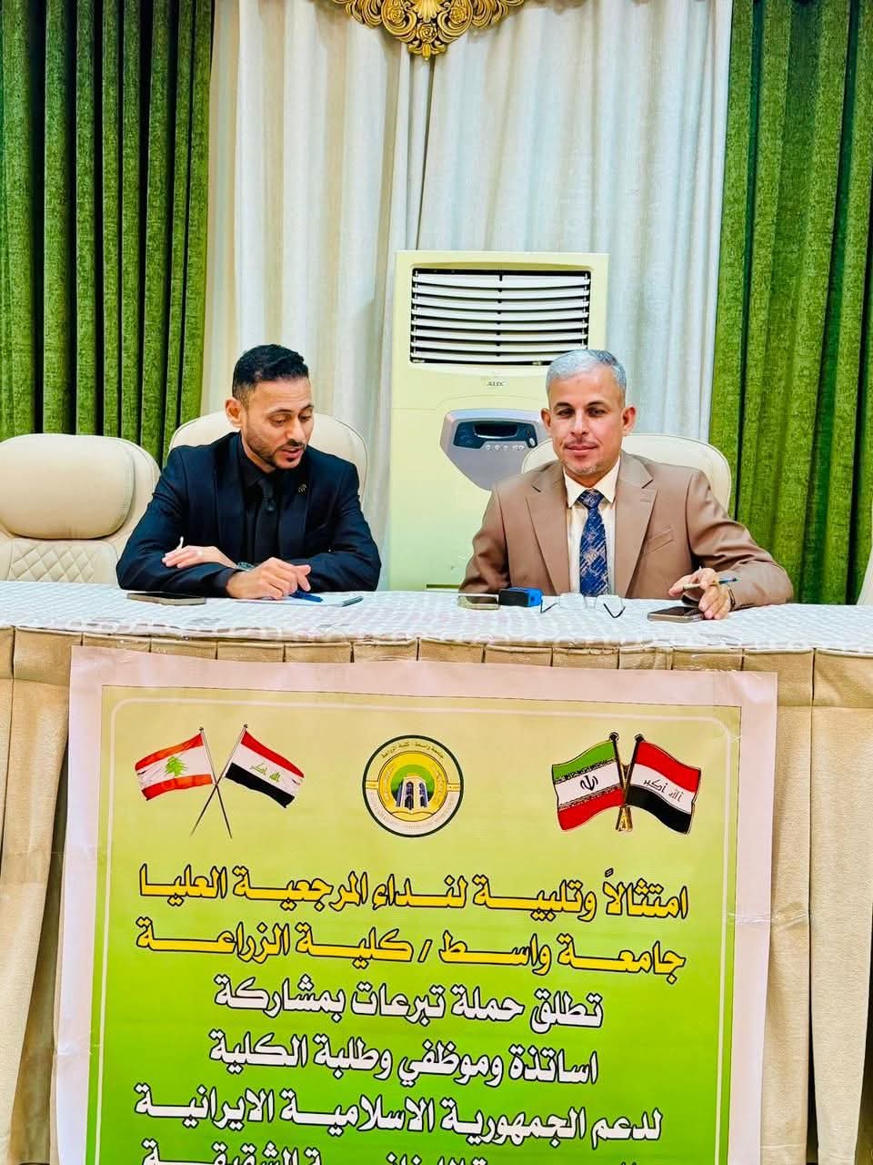 كلية الزراعة في جامعة واسط تباشر باستلام التبرعات لإغاثة الشعبين اللبناني والإيراني باشرت كلية الزراعة في جامعة واسط باستلام التبرعات المالية لإغاثة الشعبين اللبناني والإيراني استنادًا إلى توجيهات المرجعية الدينية العليا وبإشراف مباشر من عميد كلية