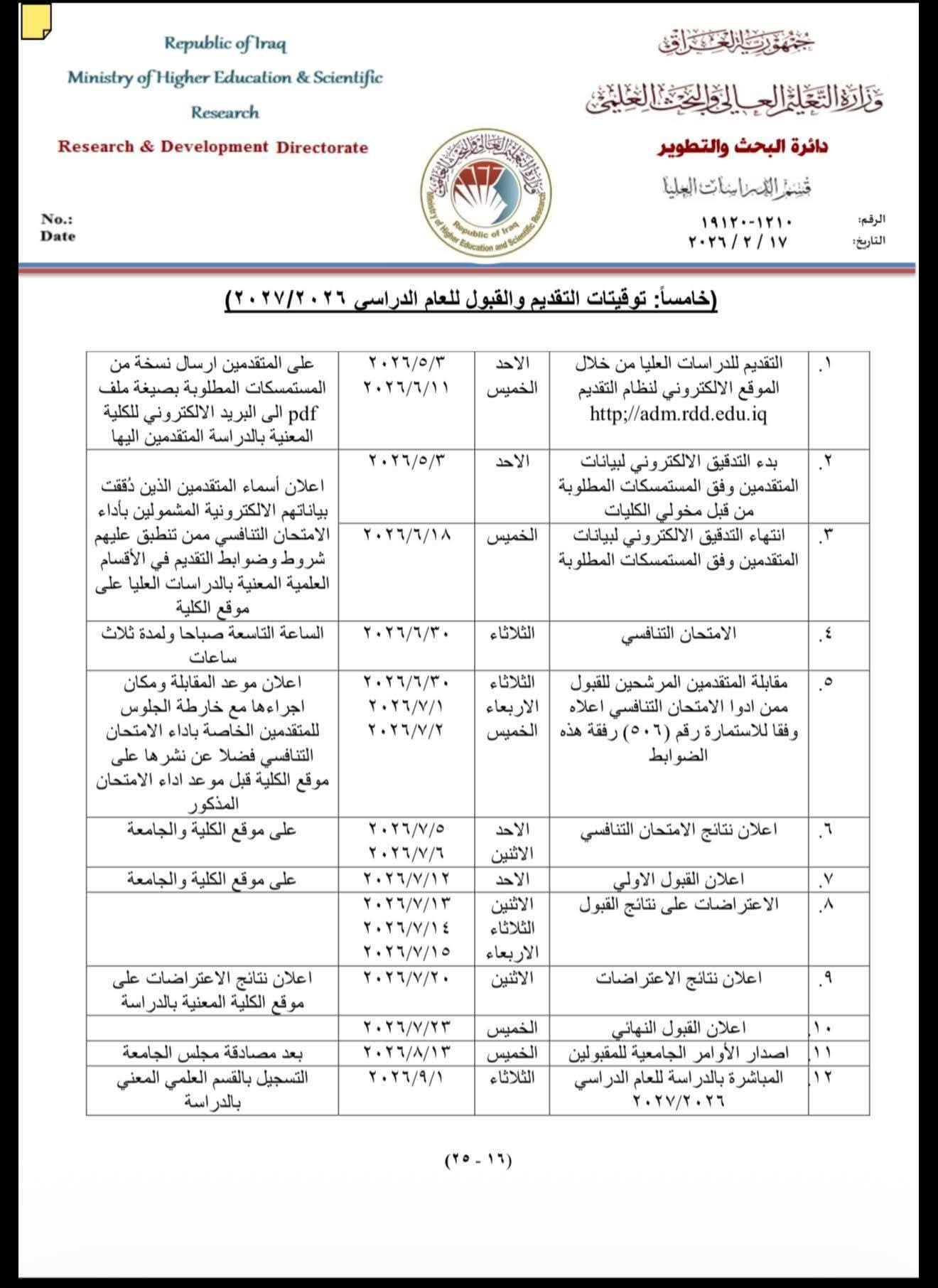 الى الطلبة الراغبين بالتقديم للدراسات العليا ماجستير احياء مجهرية في كليتنا نرفق لكم طيا" عدد المقاعد في كليتنا والمواد الخاصة بالامتحان التنافسي والخلفيات العلمية للراغبين بالتقديم الى كليتنا ..علما ان التقديم للدراسات العليا يبدأ يوم الاحد المصادف ٣/ ٥ / ٢٠٢٦