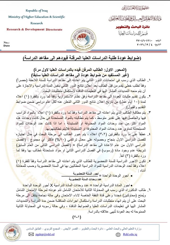 أدناه ضوابط عودة طلبة الدراسات العليا المرقنة قيودهم إلى مقاعد الدراسة